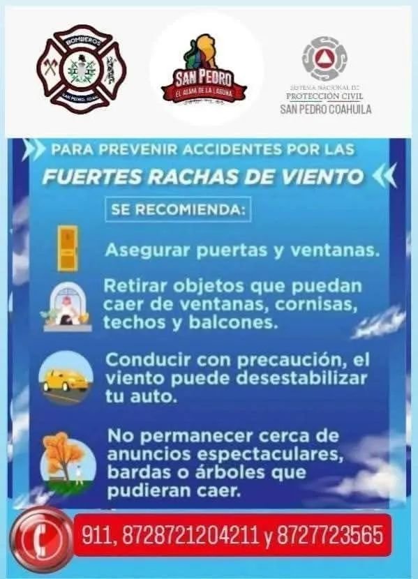 San Pedro, Coahuila.- Bomberos, Protección Civil y el Grupo de Reacción Inmediata, informan a la comunidad sobre la presencia de fuertes ráfagas de viento pronosticadas para este sábado y domingo, por lo que se exhorta a tomar precauciones para evitar incidentes.