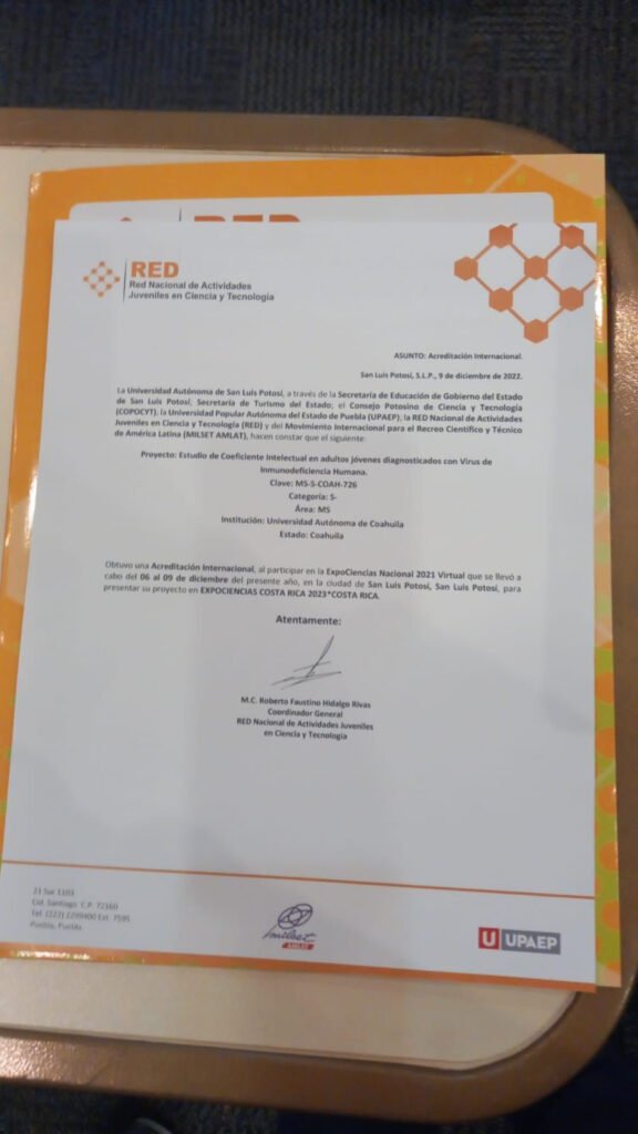 Araceli Guzmán obtuvo su pase al concurso nacional al obtener el primer lugar en la categoría de Medicina en ExpoCiencias Coahuila, con el proyecto “Estudio del coeficiente intelectual en personas diagnosticadas con el virus de inmunodeficiencia humana”, el cual tiene como objetivo la comparación del coeficiente intelectual entre personas con diagnóstico de Virus de Inmunodeficiencia Humana y sin él, basada en una población total de 30 personas, y cuya división de grupos se creó heterogéneamente con respecto a la variable a la que corresponde.