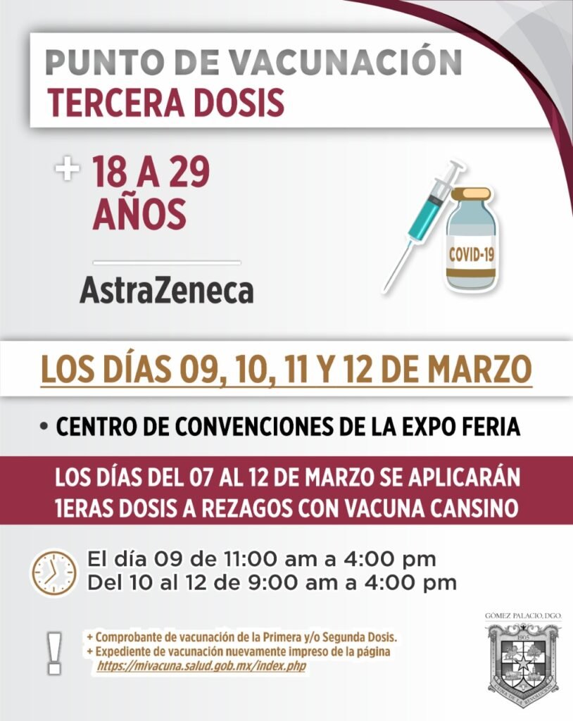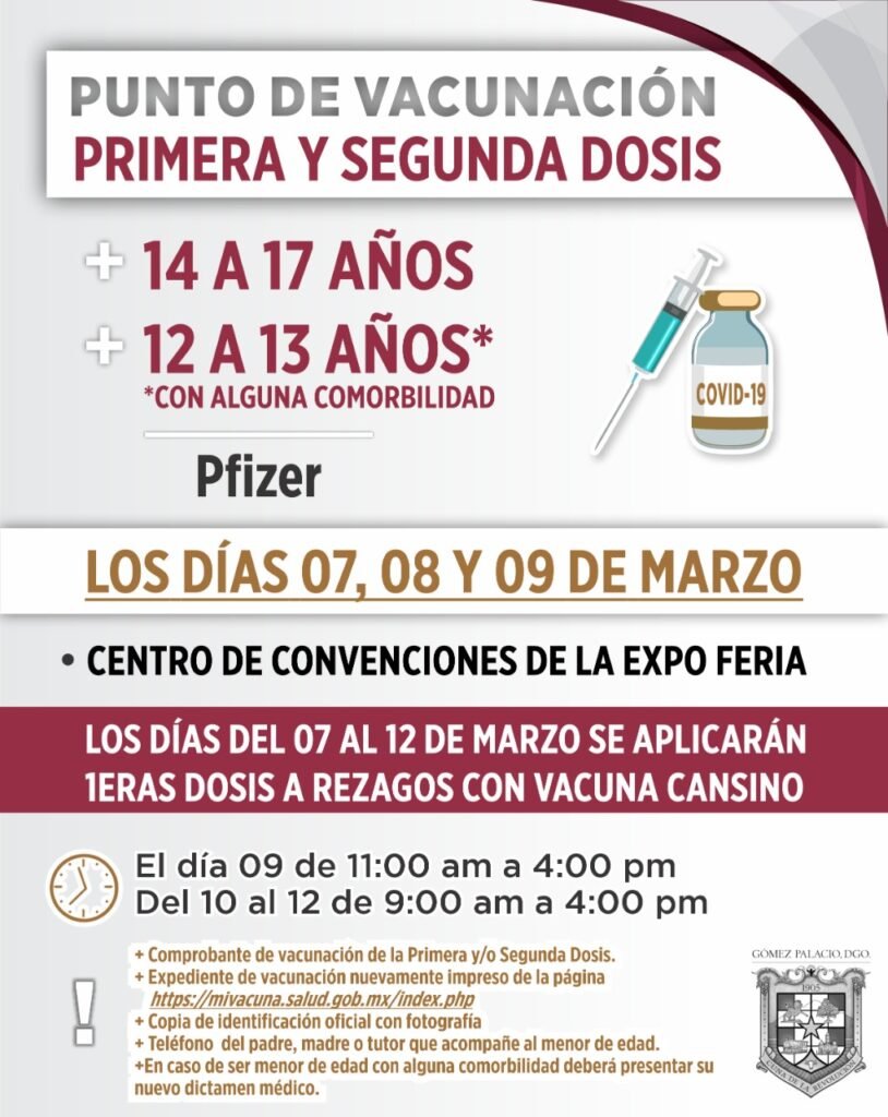 Gómez Palacio, Durango,. Compartimos el punto donde se llevará a cabo la campaña de vacunación contra Covid-19 para la primera y segunda dosis de Pfizer para menores de 14 a 17 años y de 12 a 13 años con alguna comorbilidad, al igual que la tercera dosis de AstraZeneca para personas de 19 a 29 años, y la primera dosis a rezagos con vacuna Cansino.