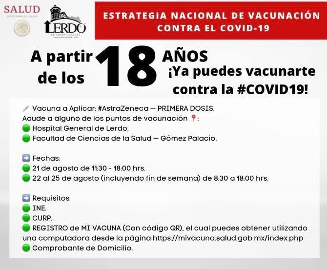 Será del sábado 21 al miércoles 25 de agosto cuando se lleve a cabo la aplicación de la primera dosis para la vacunación contra el COVID-19 de los jóvenes y adultos de 18 a 29 años de edad, en el municipio de Lerdo, Durango, así lo dio a conocer la Delegación Federal de Programas para el Desarrollo de Durango (@GobMxDgo) por medio de sus redes sociales oficiales.