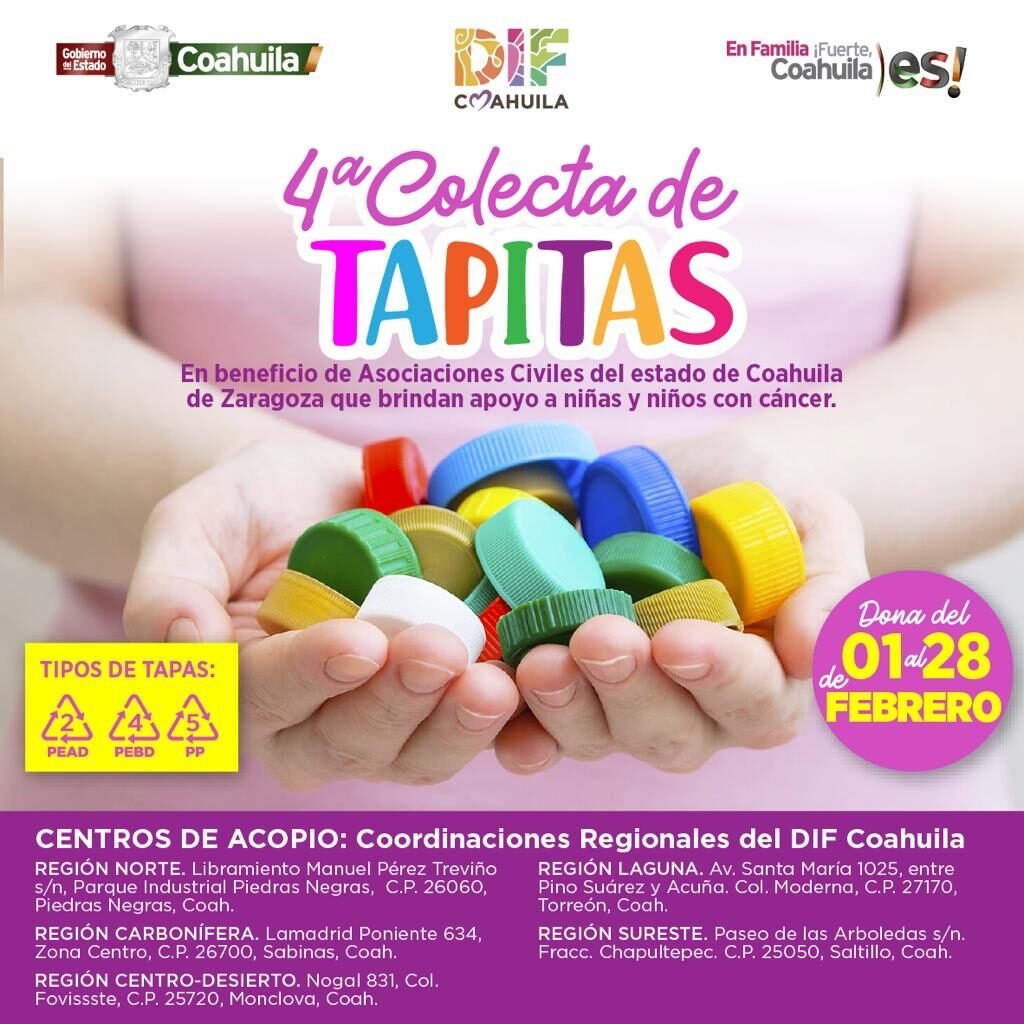 En la Región Laguna, se recibirán las tapitas en la Avenida Santa María 1025, Colonia Moderna, entre Pino Suárez y Acuña, en Torreón.