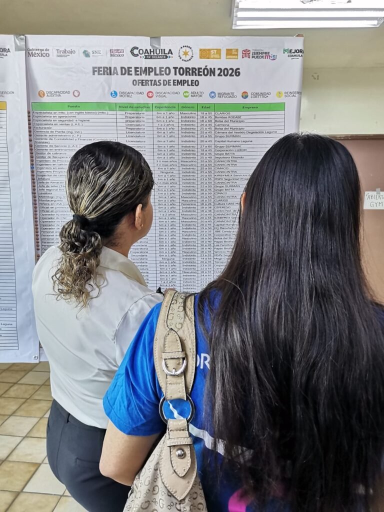 Torreón, Coahuila.- Un total de 860 personas se dieron cita este viernes a la Feria de Empleo realizada en el Gimnasio de la Unidad Deportiva de Torreón, la primera del año 2026 en esta ciudad y donde se ofertaron más de mil vacantes, con la participación de 38 empresas.