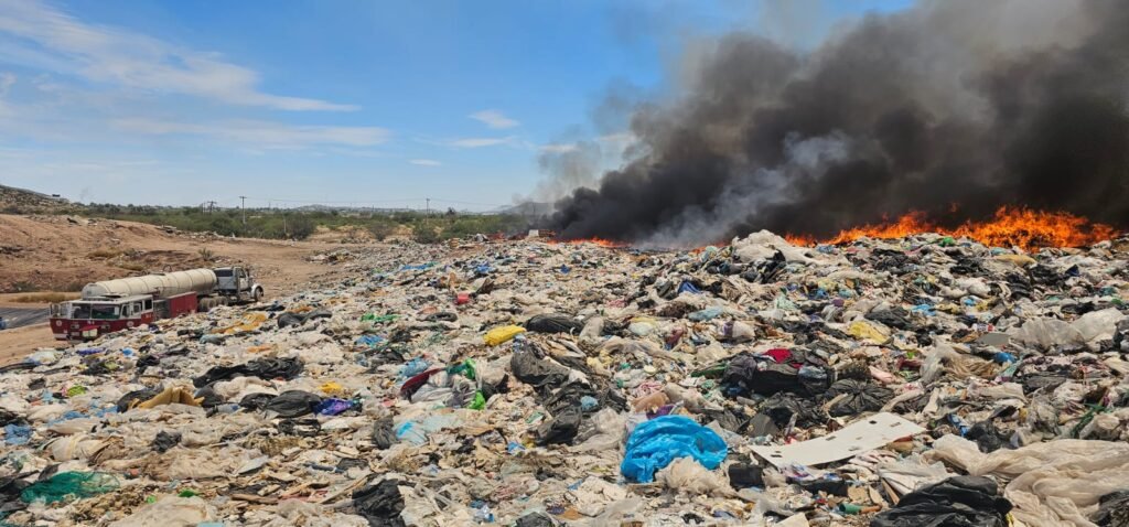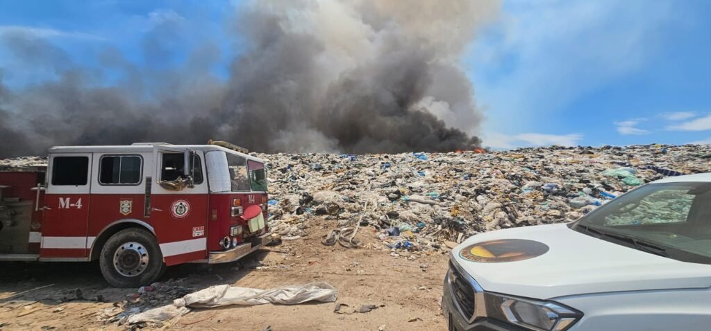 Gómez Palacio, Durango.- El incendio registrado la mañana de este domingo en el relleno sanitario de Gómez Palacio se encuentra bajo control gracias a la oportuna intervención del Heroico Cuerpo de Bomberos, en coordinación con la Dirección de Servicios Públicos, sin que represente riesgo para la población.