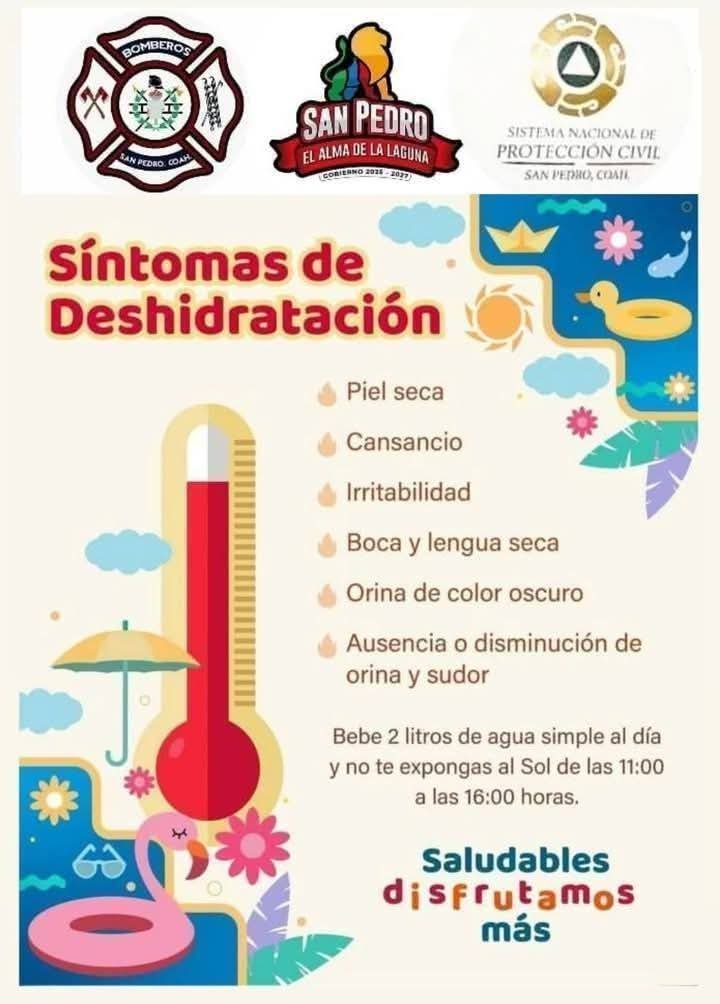 San Pedro, Coahuila.- Ante las elevadas temperaturas que se registran en el municipio, las corporaciones de Bomberos, Protección Civil y el Grupo de Reacción Inmediata emiten un llamado a la población para extremar precauciones y prevenir el llamado estrés térmico, condición que puede afectar gravemente la salud.