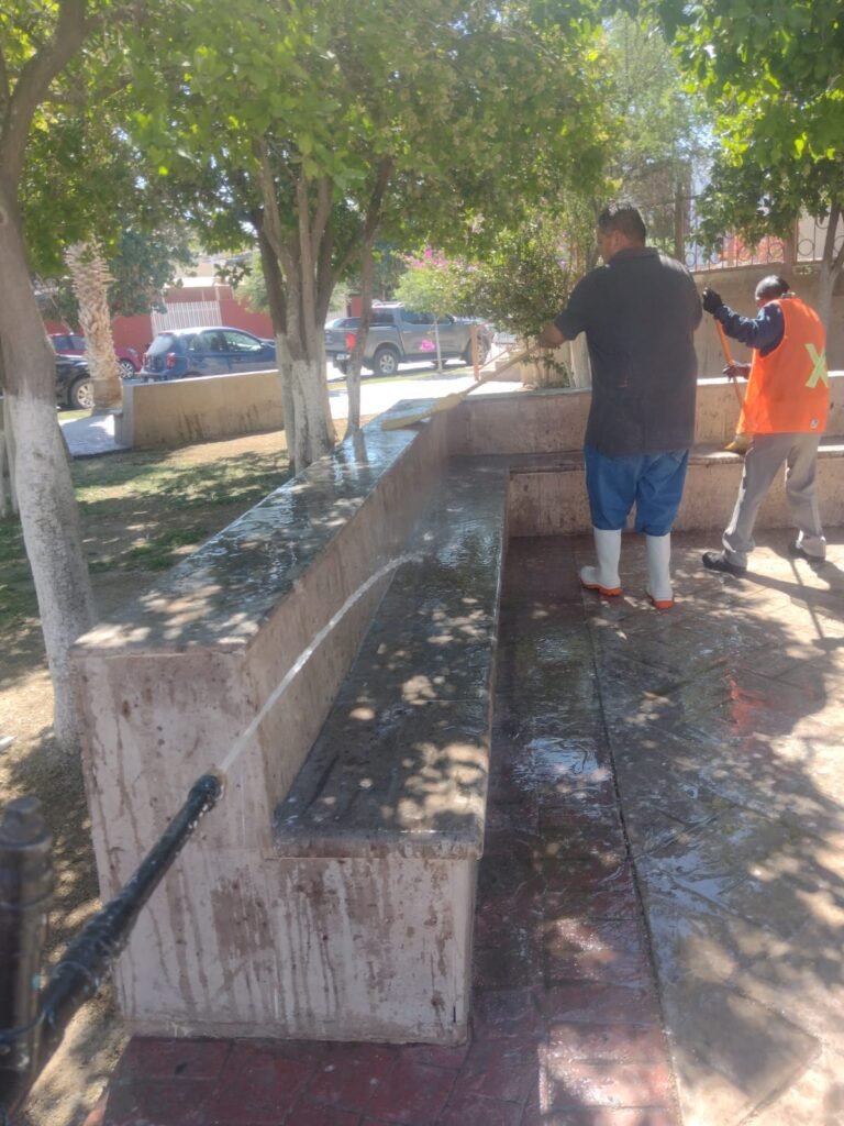 San Pedro, Coahuila.- Con el objetivo de mejorar la imagen urbana y brindar espacios dignos a la población, brigadas de la Dirección de Servicios Públicos Municipales llevaron a cabo labores de limpieza en bancas y andadores de la plaza principal.