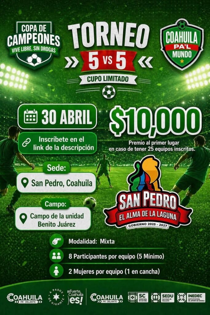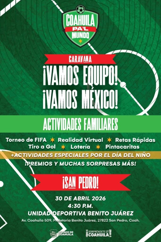 San Pedro, Coahuila.- Presidencia Municipal y el Gobierno del Estado de Coahuila realizarán la Caravana Mundialista para festejar a los niños y las niñas este jueves 30 de abril en la Unidad Deportiva «Benito Juárez».