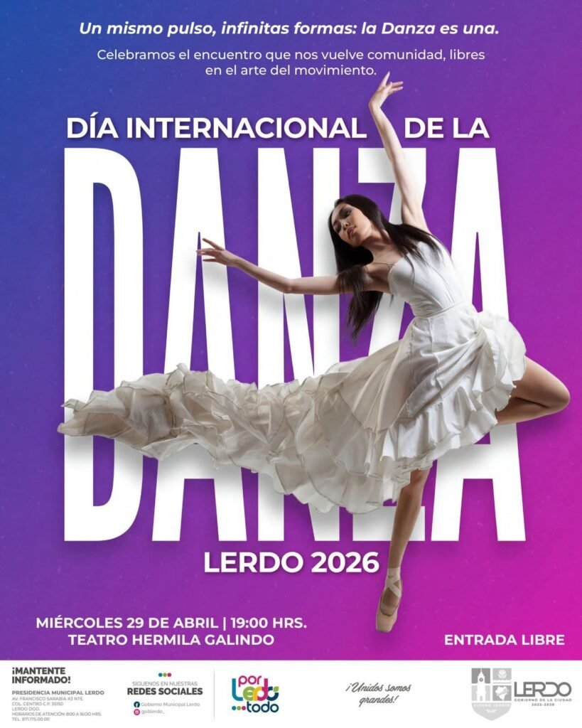 Lerdo, Durango.- El Gobierno Municipal de Lerdo, a través de la Dirección de Arte y Cultura, invita a la ciudadanía a la celebración del Día Internacional de la Danza, que tendrá lugar este miércoles 29 de abril en el Teatro Hermila Galindo, en punto de las 19:00 horas.