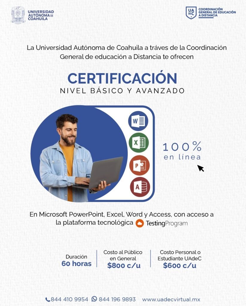 Saltillo, Coahuila.- La Universidad Autónoma de Coahuila a través de la Coordinación General de Educación a Distancia, invita a certificarse internacionalmente en Microsoft Office a través de la plataforma Testing Program, el costo del curso por aplicación para el público en general es de $800 pesos y para trabajadores y estudiantes de la institución es de $600.