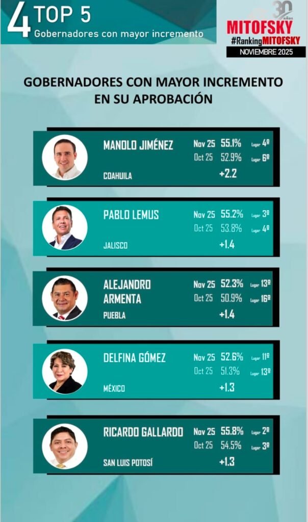 Además, en los resultados publicados por la casa encuestadora GobernArte, el gobernador de Coahuila, Manolo Jiménez Salinas, se ubica en la segunda posición a nivel nacional en el índice de aprobación gubernamental.