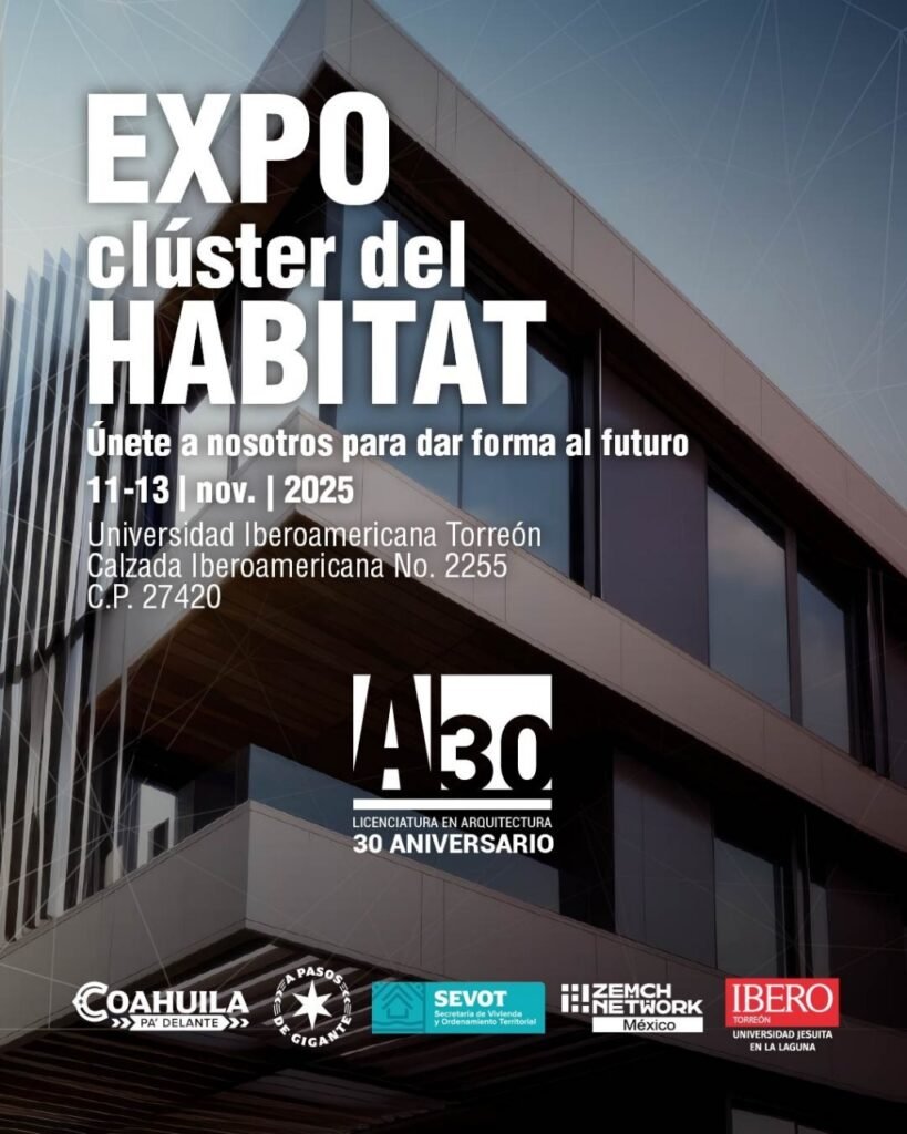 Saltillo, Coahuila.- El Gobierno del Estado de Coahuila, a través de la Secretaría de Vivienda y Ordenamiento Territorial (SEVOT), impulsará la participación de la comunidad académica, estudiantil y profesional en el Expo Clúster del Hábitat / ZEMCH 2025, un encuentro internacional que se llevará a cabo del 11 al 13 de noviembre en la Universidad Iberoamericana Torreón, con la participación de más de 40 países.