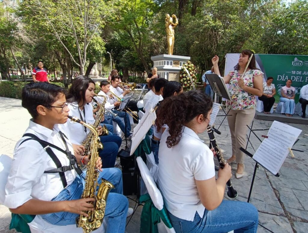 Lerdo, Durango.- Este domingo al pie del monumento alusivo al padre, ubicado en la Plazuela Juárez, se llevó a cabo un acto civico para celebrar el día del padre, que se festeja en el país el tercer domingo del mes de junio, el evento inició con la interpretación de las mañanitas a cargo de la banda infantil y juvenil de Lerdo.