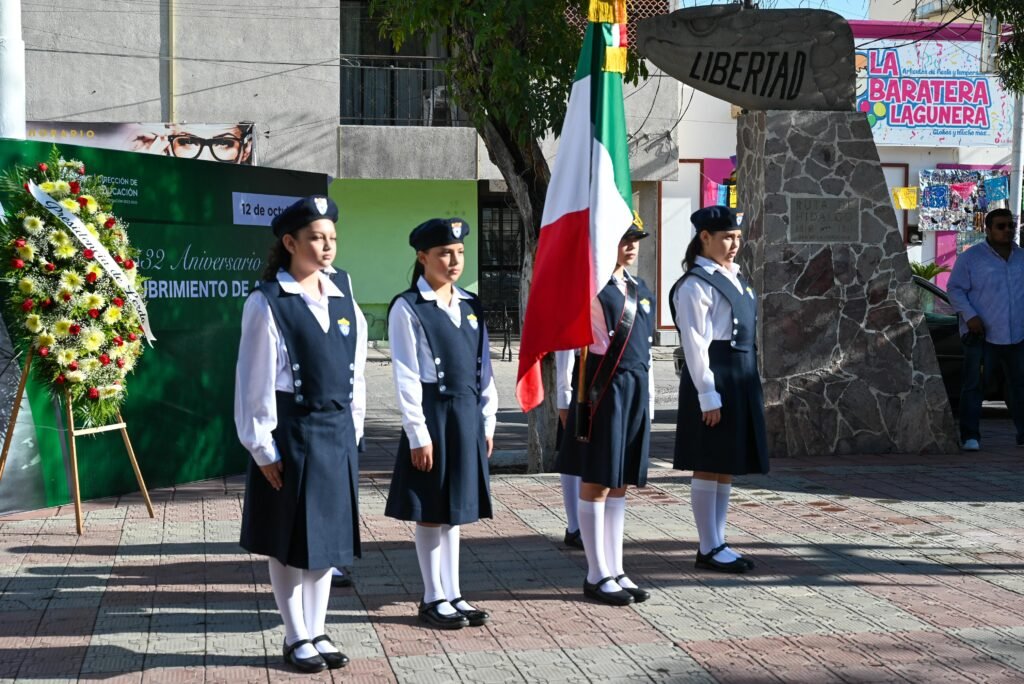 Lerdo, Durango.- El Gobierno Municipal de Lerdo a través de la dirección de Educación, conmemoró el 532 aniversario del Descubrimiento de América, en la plaza principal frente al hasta de la bandera monumental, con un acto cívico y colocación de ofrenda floral.