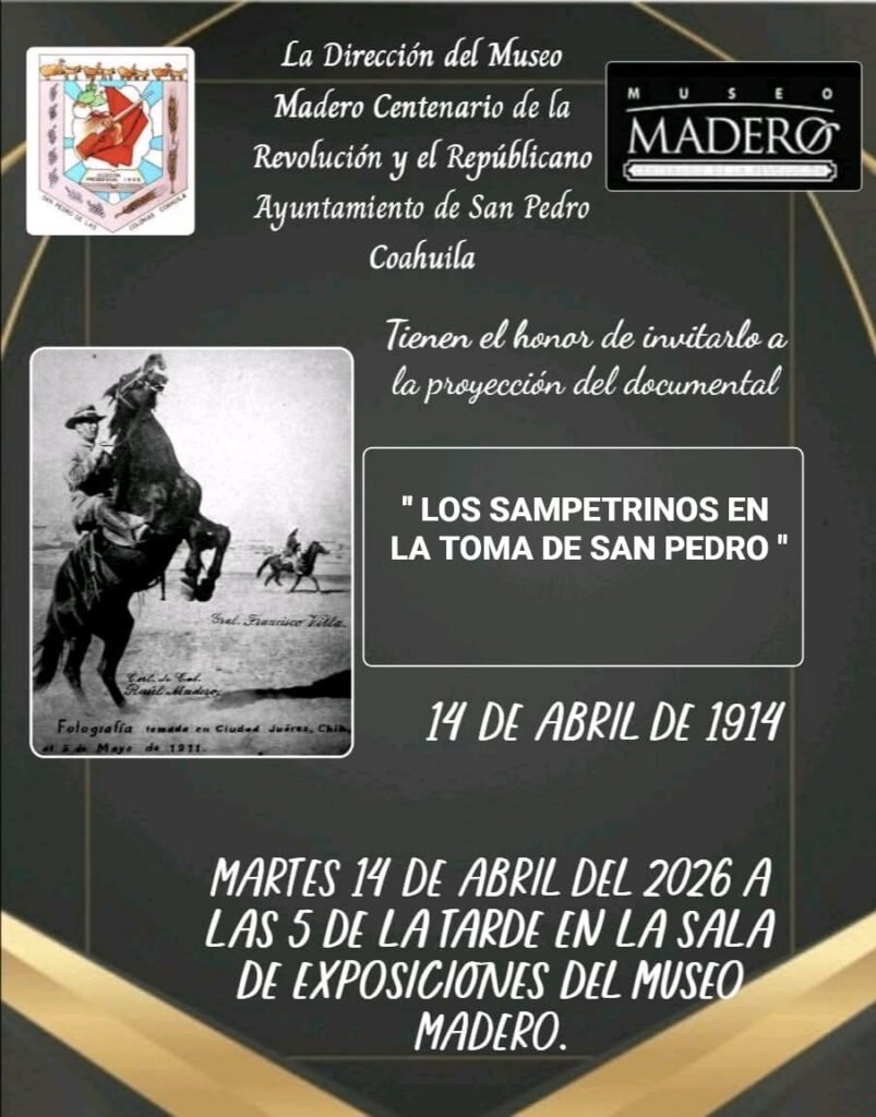 A las 5:00 de la tarde, en coordinación con el Museo «Madero-Centenario de la Revolución Mexicana» tendrá lugar la proyección del documental «Los sampetrinos en la toma de San Pedro», del cronista municipal Luis Martín Távarez Gutiérrez, en la sala de exposiciones temporales del museo.