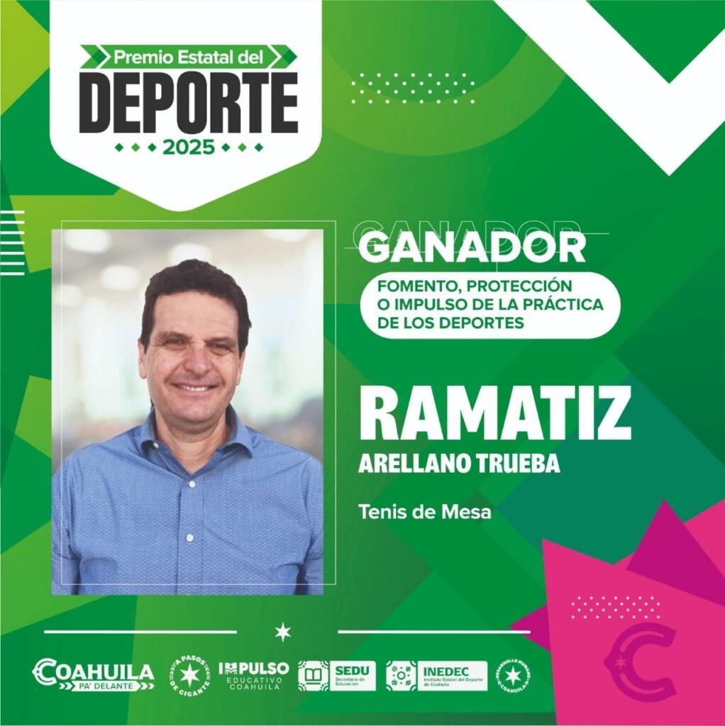 Ramatiz Arellano Trueba se llenó la distinción en la categoría Fomento y/o Protección o Impulso al Deporte por sus grandes aportes al desarrollo del tenis de mesa en Coahuila; Olivia Contreras Valdés fue elegida ganadora como Deportista Master y/o Veteranos resultado a su gran legado en el sófbol.