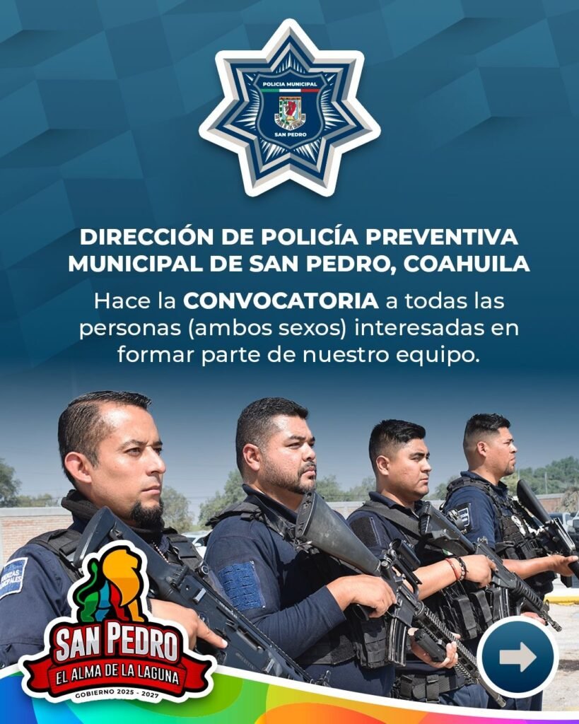 San Pedro, Coahuila.- El Gobierno Municipal emitió la convocatoria para ingresar a la Dirección de Policía Preventiva Municipal, a través de la Academia de Formación Policial.