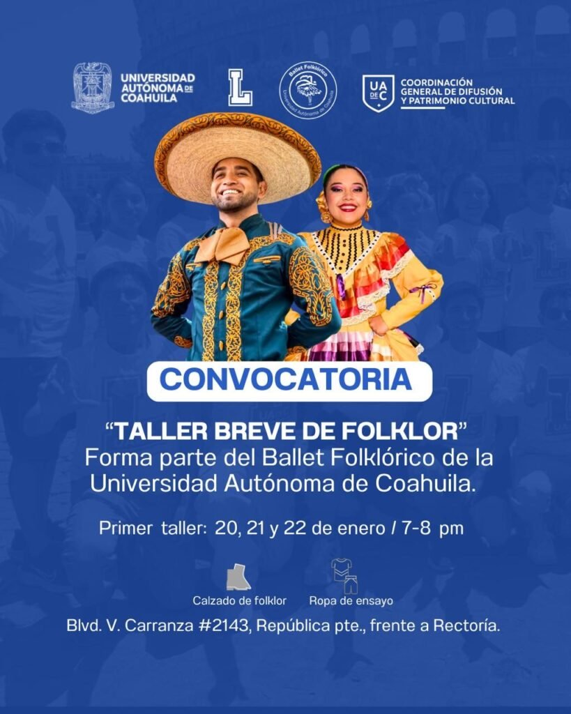 Saltillo, Coahuila.- La Universidad Autónoma de Coahuila a través de la Coordinación General de Difusión y Patrimonio Cultural, convoca a su comunidad universitaria y público en general con experiencia en danza folklórica, a participar en la “CONVOCATORIA 2026” para integrarse al elenco del Ballet Folklórico de la UAdeC.