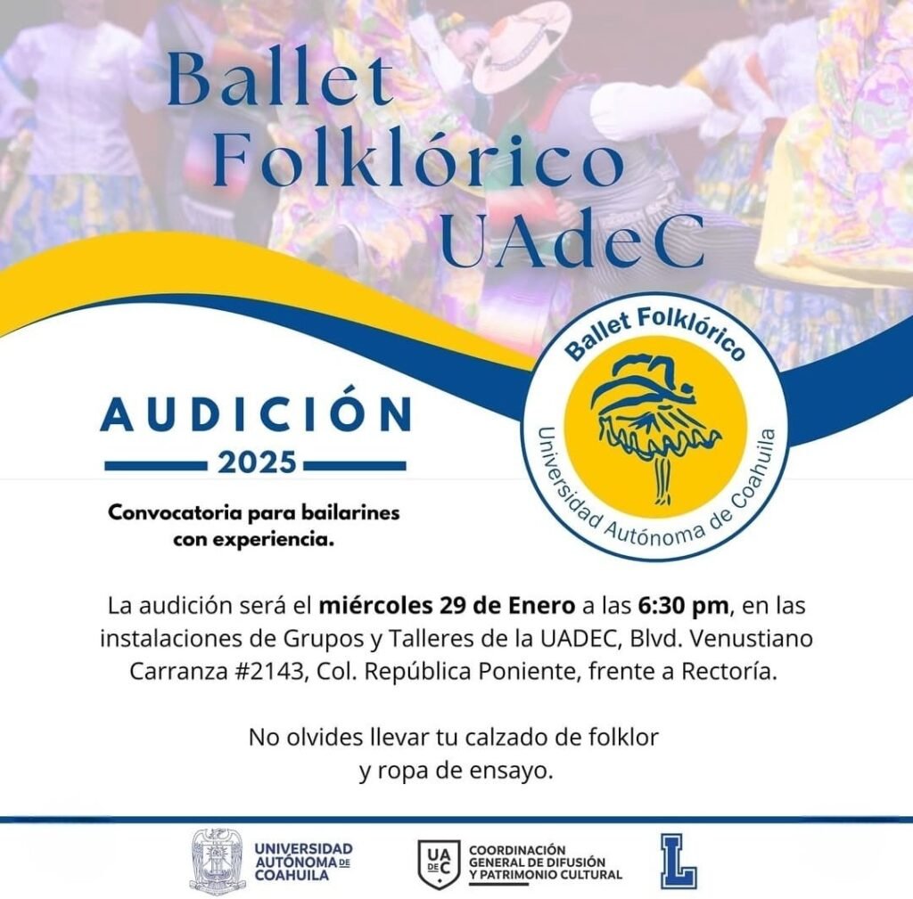 Saltillo, Coahuila.- La Universidad Autónoma de Coahuila a través de la Coordinación General de Difusión y Patrimonio Cultural convoca a su comunidad universitaria y público en general con experiencia en danza folklórica, a participar en la “Audición 2025” para integrarse al elenco del Ballet Folklórico de la UAdeC.
