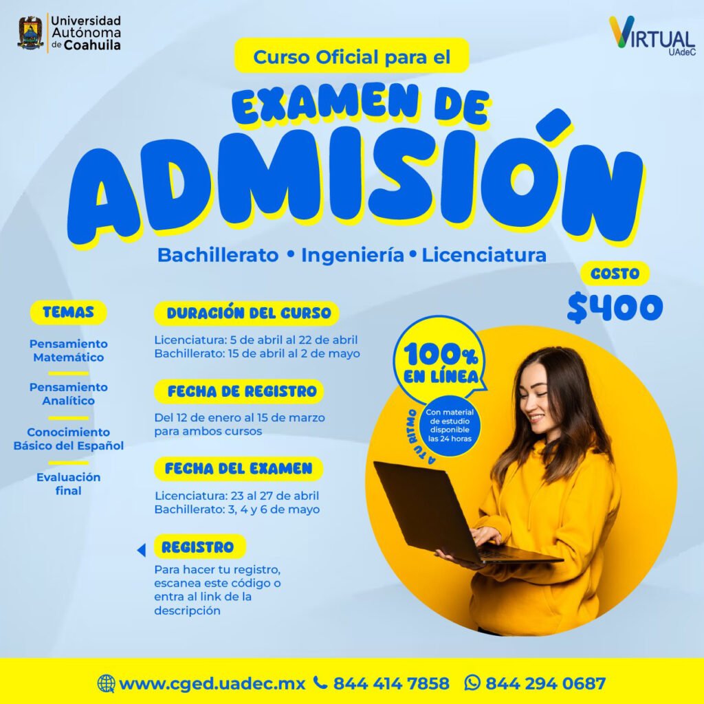 Saltillo, Coahuila.- La Universidad Autónoma de Coahuila, a través de la Coordinación General de Educación a Distancia, convoca a los aspirantes a ingresar a bachillerato y licenciatura para el semestre agosto-diciembre de 2024 a inscribirse hasta el 15 de marzo al Curso de Preparación para el Examen de Admisión 100 por ciento en Línea.