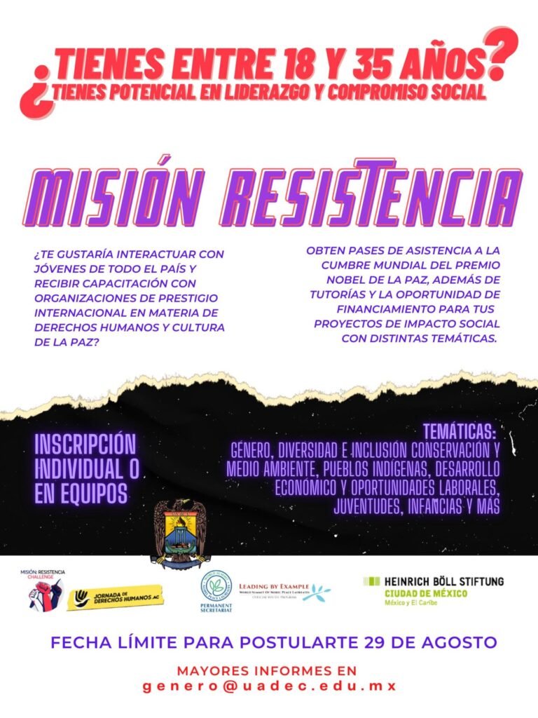 El Programa de Becas de Formación Internacional “Misión Resistencia” es un programa semipresencial (online-presencial) vivencial, interactivo, practico/teórico con duración de 8 meses, que tiene tres objetivos centrales: 1) Identificar e impulsar el desarrollo de habilidades de juventudes mexicanas que tengan entre 18 y 35 años de edad, con fuerte potencial de liderazgo y compromiso de servicio con sus comunidades, que habiten en los estados de Yucatán, Campeche, Quintana Roo, Chiapas, Oaxaca y Coahuila en alianza con instituciones, organizaciones y líderes del más alto prestigio nacional e internacional en el campo de los derechos humanos y la cultura de paz.
