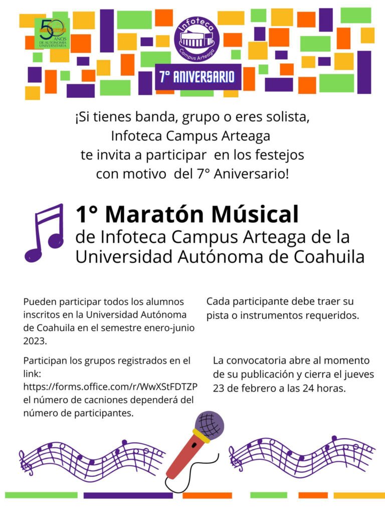 Así mismo, se invita a los estudiantes al Primer Maratón Musical, los participantes deberán de registrarse en el link https://forms.office.com/r/WwXStFDTZP, el número de canciones dependerá del número de participantes y cada quien deberá traer su pista o instrumentos requeridos, la convocatoria cierra el 23 de febrero a las 24:00 horas.