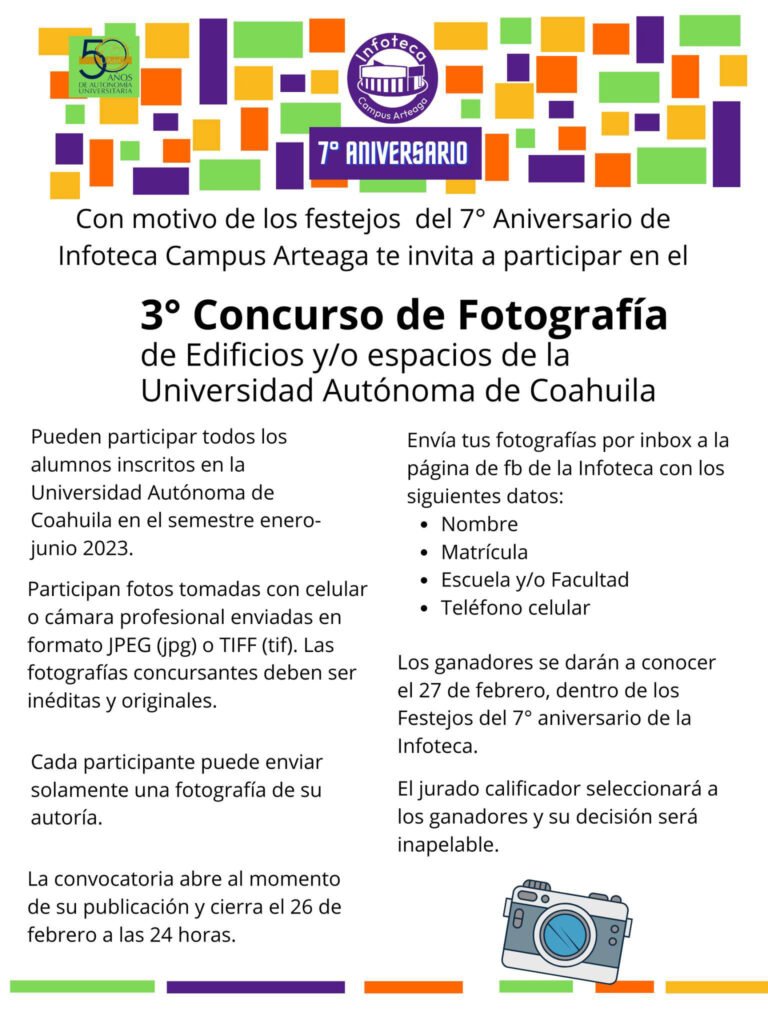 Arteaga, Coahuila.- Con motivo de los festejos del séptimo aniversario de la Infoteca Campus Arteaga de la Universidad Autónoma de Coahuila, se invita a la comunidad universitaria al Tercer Concurso de Fotografía de Edificios o Espacios de la Universidad y al Primer Maratón Musical.