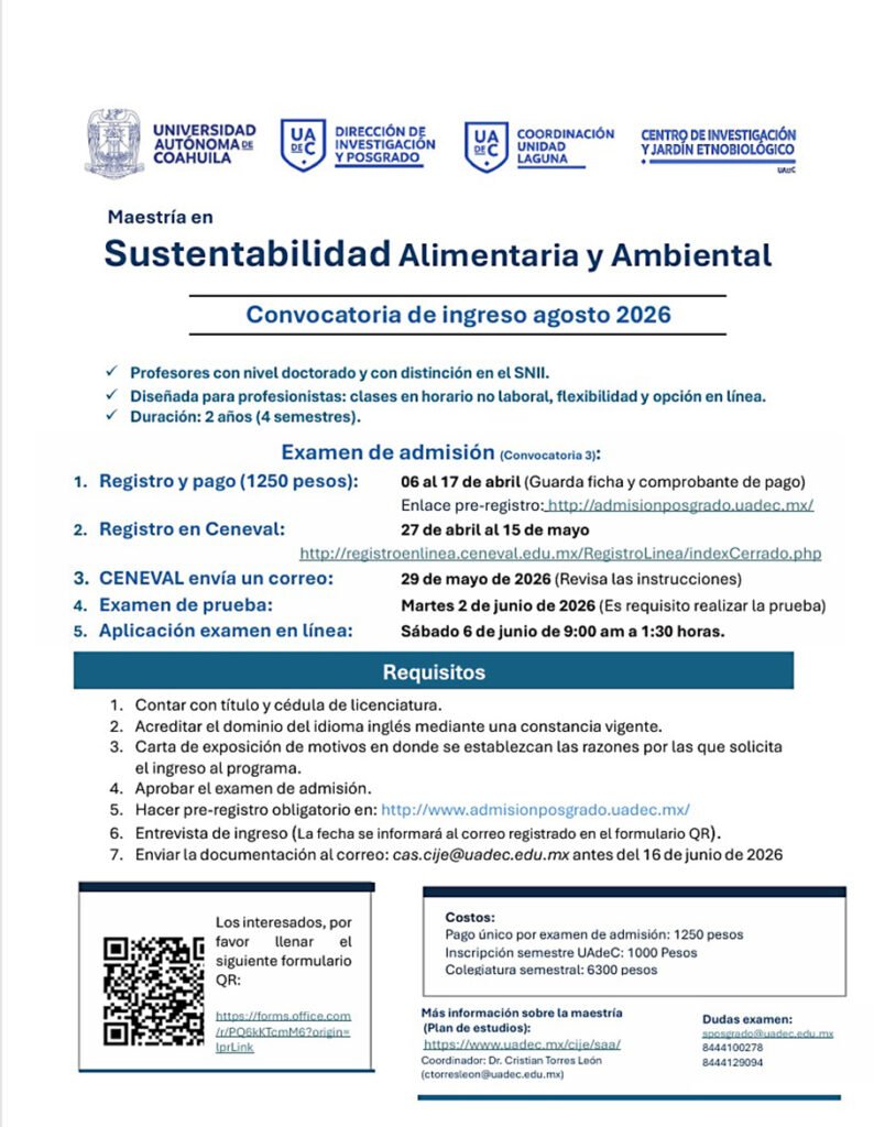 Saltillo, Coahuila.- A todos los profesionistas interesados en el desarrollo sostenible, la Universidad Autónoma de Coahuila, a través de la Dirección de Investigación y Posgrado, la Coordinación de Unidad Laguna y el Centro de Investigación y Jardín Etnobiológico del Semidesierto de Coahuila (CIJE), invita a cursar la Maestría en Sustentabilidad Alimentaria y Ambiental, para el semestre agosto-diciembre 2026.