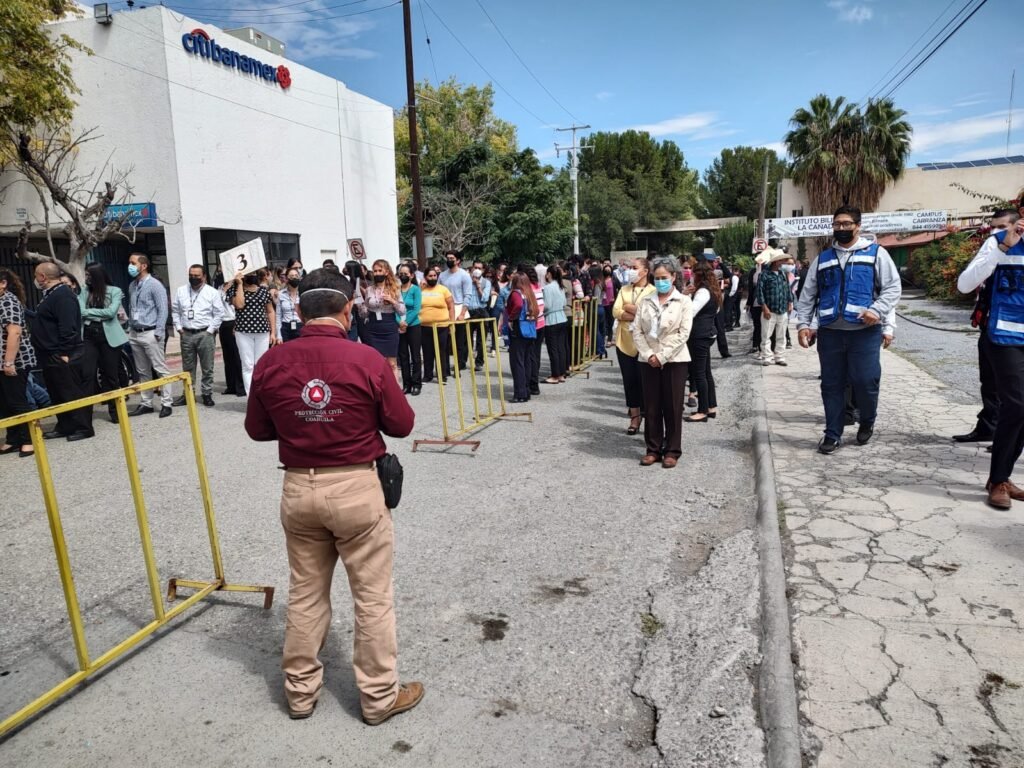 A las 10:00 horas, el peculiar sonido de las alarmas se escuchó en todos los inmuebles que conforman la Secretaría de Educación de Coahuila, y fueron saliendo los trabajadores de sus áreas guiados por las brigadas hacia los puntos de reunión de los patios principales de cada edificio.