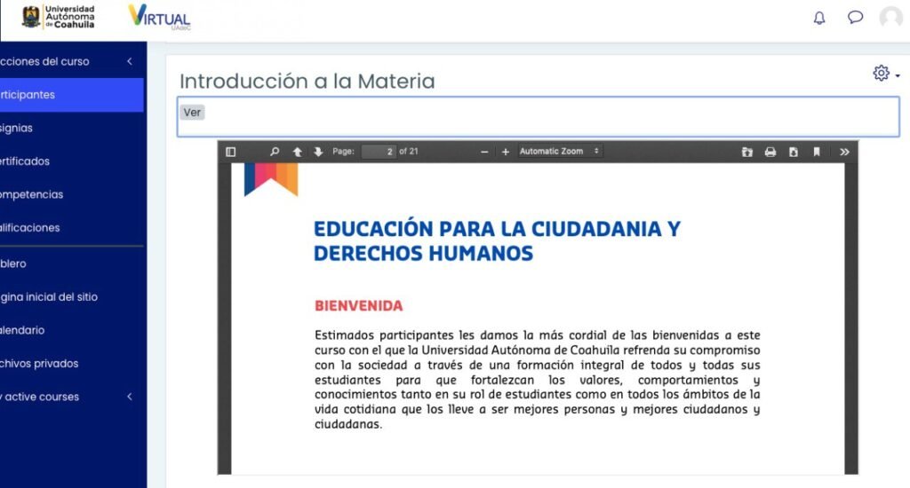 Saltillo, Coahuila.- Desde el pasado 1 de septiembre de 2022 alumnos de la Universidad Autónoma de Coahuila cursan la materia en línea “Educación para la ciudadanía y Derechos Humanos”, la cual implementó la Defensoría de los Derechos Humanos Universitarios y la Coordinación de Educación a Distancia y que se está imparte en las tres unidades Saltillo, Torreón y Norte en 45 escuelas y facultades.