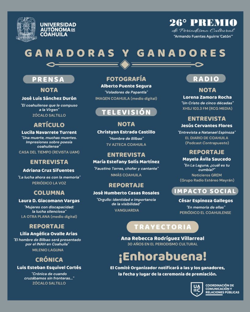 Saltillo, Coahuila.- La Universidad Autónoma de Coahuila anuncia a los ganadores de la vigésima sexta edición del Premio de Periodismo Cultural Armando Fuentes Aguirre “Catón”, que se realiza con el objetivo de reconocer la labor periodística que busca compartir las distintas expresiones artísticas y culturales del estado.