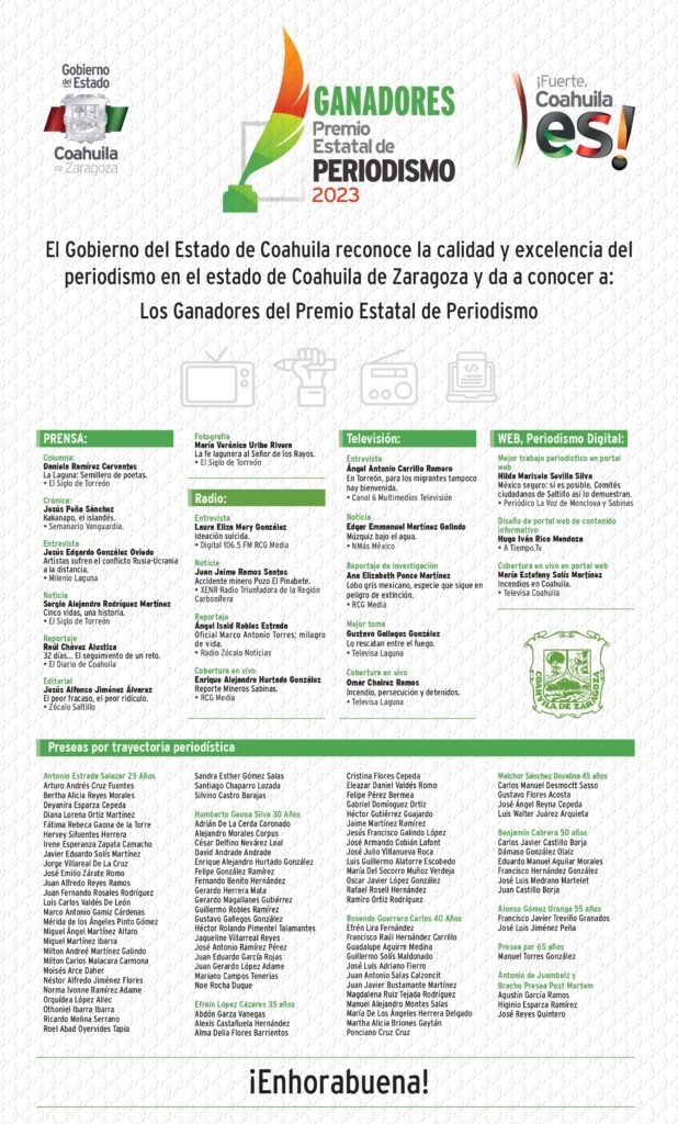 La Coordinación General de Comunicación e Imagen Institucional del Estado, a cargo de Fernando Simón Gutiérrez Pérez, dio a conocer la lista de las y los triunfadores del certamen con que el Gobierno de Coahuila reconoce la calidad y la excelencia del trabajo de los hombres y mujeres que diariamente ejercen la noble profesión del periodismo.