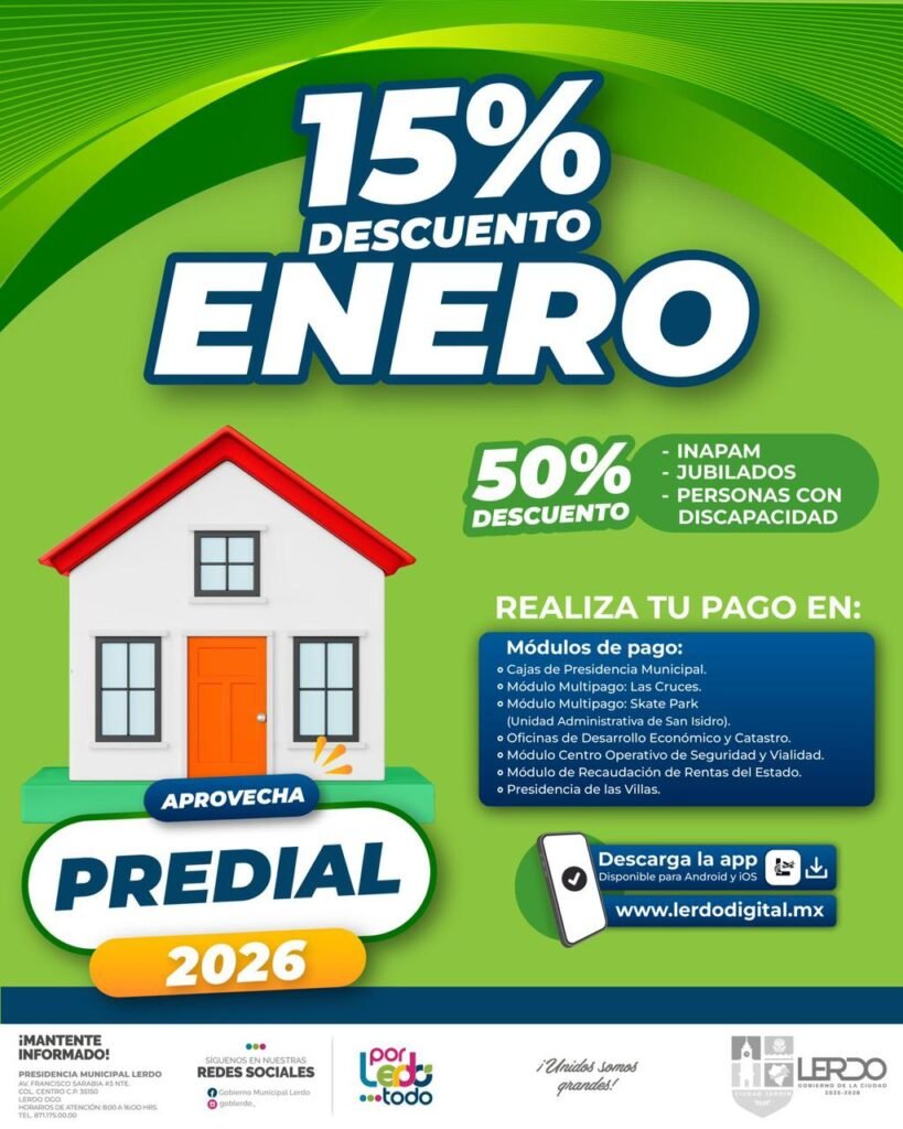 Lerdo, Durango.- Con el objetivo de facilitar a la ciudadanía el cumplimiento del pago del Impuesto Predial 2026 a partir del próximo 2 de enero, el Gobierno Municipal de Lerdo dio a conocer los distintos módulos y alternativas disponibles para realizar este trámite de manera ágil y ordenada.