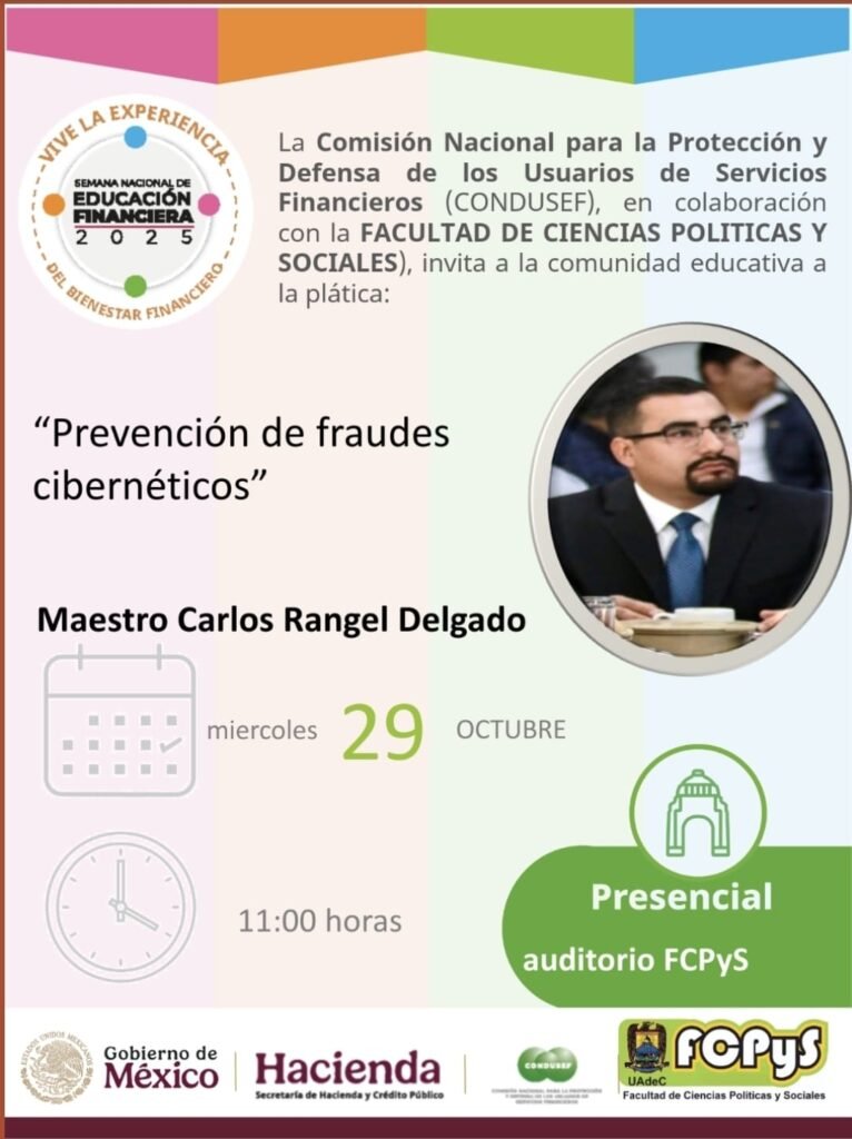 Torreón, Coahuila.- Como parte del programa de la Semana Nacional de Educación Financiera 2025 en la ciudad de Torreón, el delegado de la Región Laguna 1 de la Fiscalía General del Estado (FGE), Carlos Rangel Gámez impartirá la conferencia «Prevención de fraudes cibernéticos», programada para el miercoles 29 de octubre en el Aula Milenio de la Facultad de Ciencias Políticas y Sociales (FCPYS) de la UAdeC, Unidad Laguna.