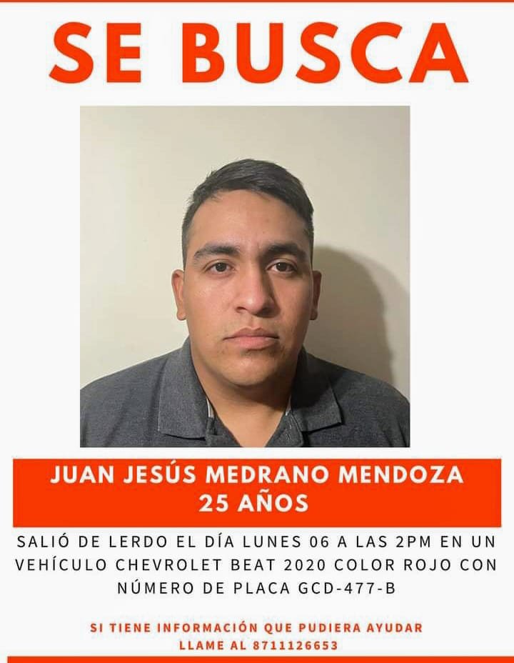 Lerdo, Durango.- A través de sus redes sociales, el regidor de la fracción de Morena de Lerdo, Gerardo Medrano Mendoza, solicita a la población su ayuda para localizar a su hermano Juan Jesús de 25 años de edad, de quien desde las dos de la tarde de ayer se desconoce su paradero.