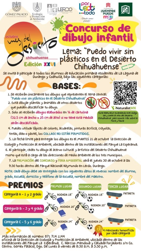 Gómez Palacio, Durango.- El Ayuntamiento de Gómez Palacio, a través de la dirección de Ecología y Protección al Ambiente, invita a todos los niños de educación primaria a participar en la XXVI Edición del Concurso de Dibujo Infantil, una iniciativa regional que este año se centra en el tema: «Puedo vivir sin plásticos en el Desierto Chihuahuense».
