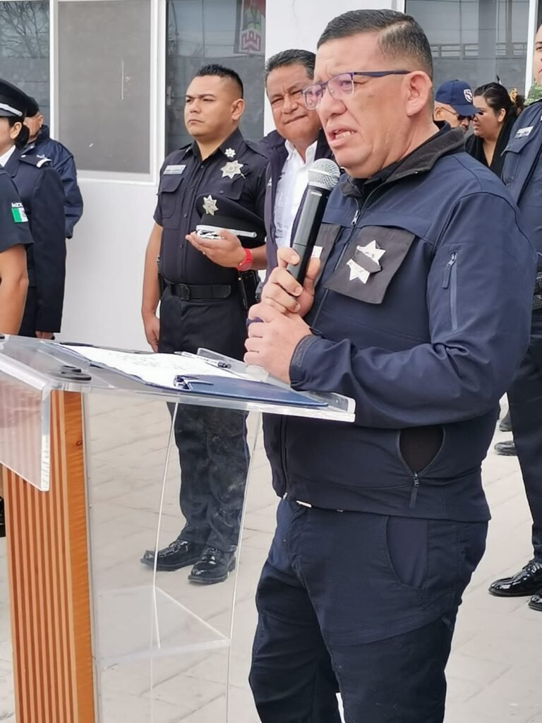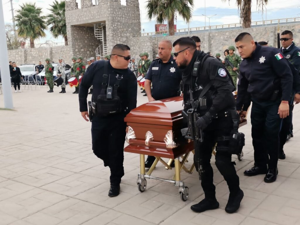 El Comisario César Antonio Perales Esparza, jefe de la DSPM, encabezó la ceremonia donde la corporación acompañó a familiares y amigos en el homenaje al oficial Hilario.
