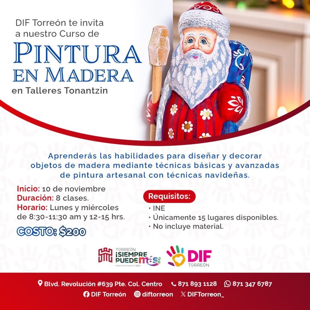Torreón, Coahuila.- El Sistema para el Desarrollo Integral de la Familia (DIF) Torreón, invita a la ciudadanía a participar en los cursos de uñas avanzado y de pintura en madera con temática navideña, que se llevarán a cabo en los Talleres Tonantzin.