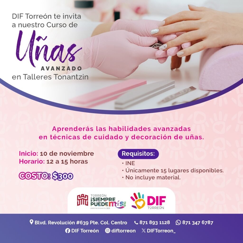El curso de uñas avanzado iniciará el lunes 10 de noviembre de 12:00 a 15:00 horas, mientras que el taller de pintura en madera con temática navideña comenzará el mismo día, pero de 08:30 a 15:00 horas.