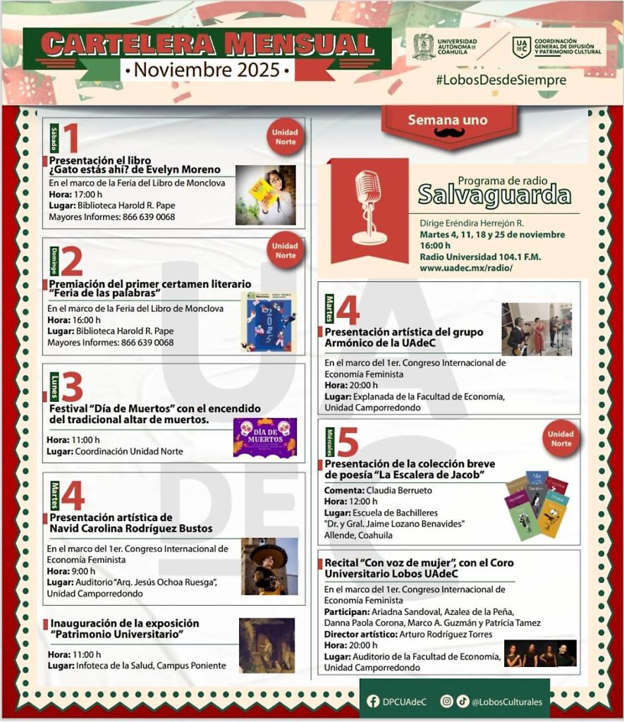 El 5 de noviembre en la Unidad Norte se presentará la colección breve de poesía “La Escalera de Jacob” a las 12:00 horas en la Escuela de Bachilleres “Dr. y Gral. Jaime Lozano Benavides” en el municipio de Allende; en la Unidad Sureste a las 19:00 horas se inaugurará la exposición “Demente gráfica” de Doc. Ramírez en el Recinto Cultural Universitario “Aurora Morales de López”, al tiempo que se ofrecerá el recital “Con voz de mujer” con el Coro Universitario Lobos UAdeC a en el Auditorio de la Facultad de Economía.