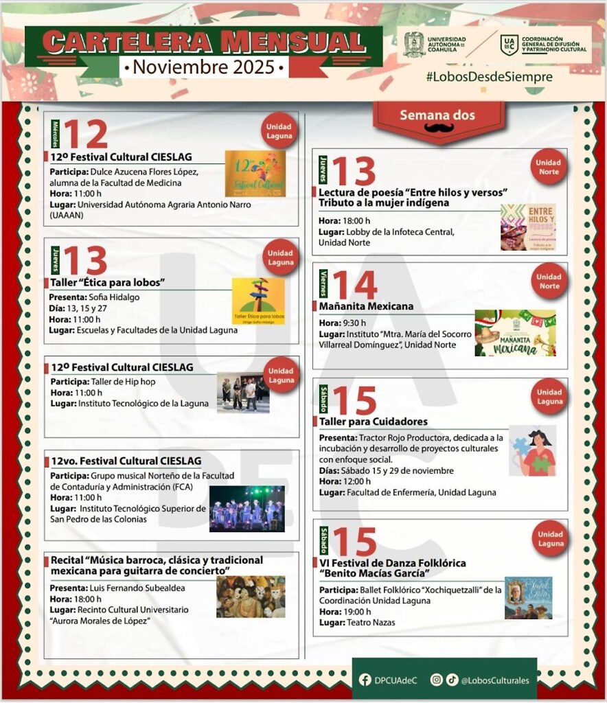 El 14 de noviembre, se realizará la “Mañanita Mexicana” a las 9:30 horas en el Instituto “Mtra. María del Socorro Villarreal Domínguez” de la Unidad Norte; el 15 de noviembre a las 12:00 horas la Facultad de Enfermería Unidad Laguna será sede del Taller para Cuidadores; además el Teatro Nazas albergará el VI Festival de Danza Folklórica “Benito Macías García” a partir de las 19:00 horas.