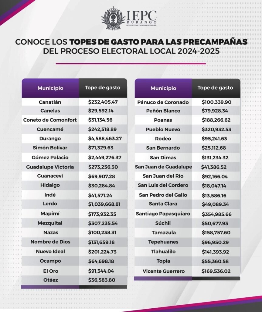 Las precampañas en los Municipios de Canatlán, Cuencamé, Guadalupe Victoria, Mapimí, Mezquital, Nombre de Dios, Nuevo Ideal, Poanas, Pueblo Nuevo, San Dimas, Santiago Papasquiaro, El Oro, Tamazula, Tlahualilo y Vicente Guerrero, darán inicio el 22 de enero.