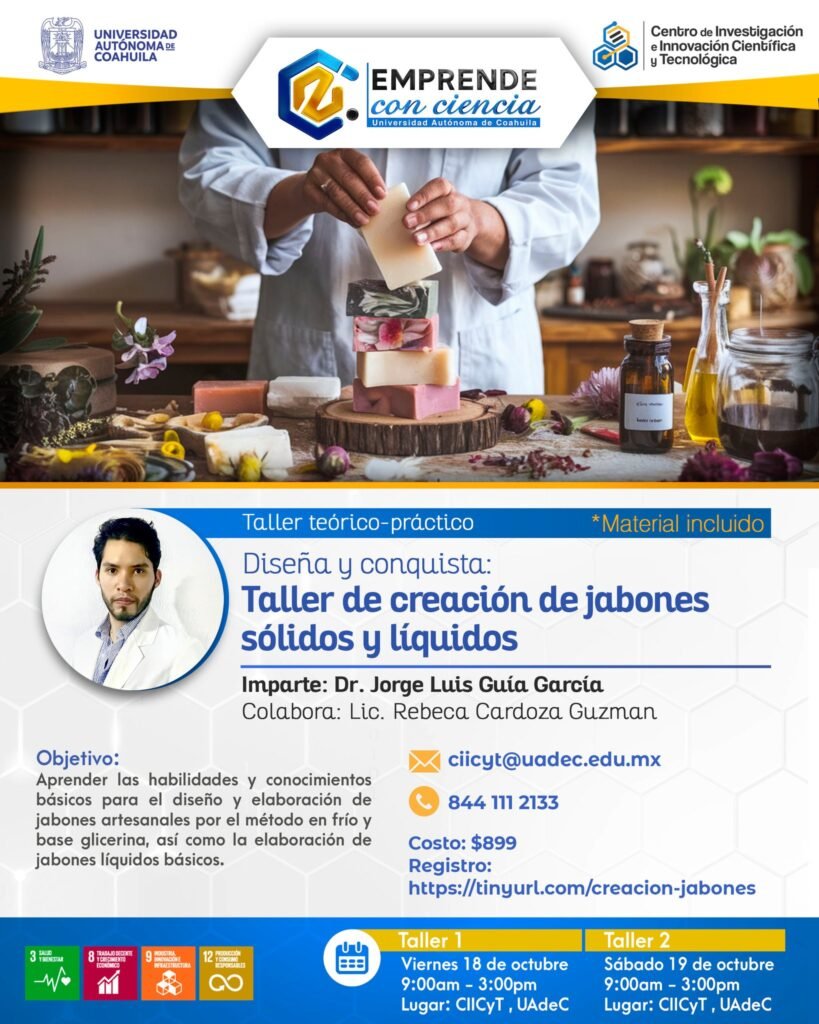 Este Taller se llevará a cabo el 18 y 19 de octubre de 9:00 a 15:00 horas, en las instalaciones del CIICYT, ubicadas en Avenida 3, esquina con Avenida 16, Colonia Lourdes en Saltillo, Coahuila; el objetivo es ofrecer a los participantes las habilidades y conocimientos básicos necesarios para el diseño y elaboración de jabones artesanales utilizando los métodos en frío y base de glicerina, así como la elaboración de jabones líquidos básicos.