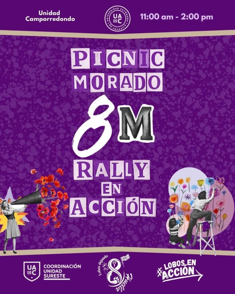 El 4 de marzo también la coordinación de Unidad Saltillo organiza un conversatorio a las 11:30 horas en el Auditorio Jesús Ochoa Ruesga, a cargo de la Dra. Kerena Hernández, la Ing. Nancy Torres, y la Dra. Alicia Hernández; el 5 de marzo una marcha interna en la Unidad de Camporredondo a las 8:30 horas, a las 10:00 horas Concurso de Expresión Artística, en la explanada de la facultad de Psicología; ese mismo día habrá el Rally en Acción Picnic Morado 8M de 11:00 a 14:00 horas y las 12:00 una conferencia en línea vía Zoom “género Feminismo y vida cotidiana; el 9 de marzo conferencia y taller vía Teams a las 18:00 y 19:00 horas “Violencia Digital” y Síndromes Adyacentes a la Violencia de pareja.