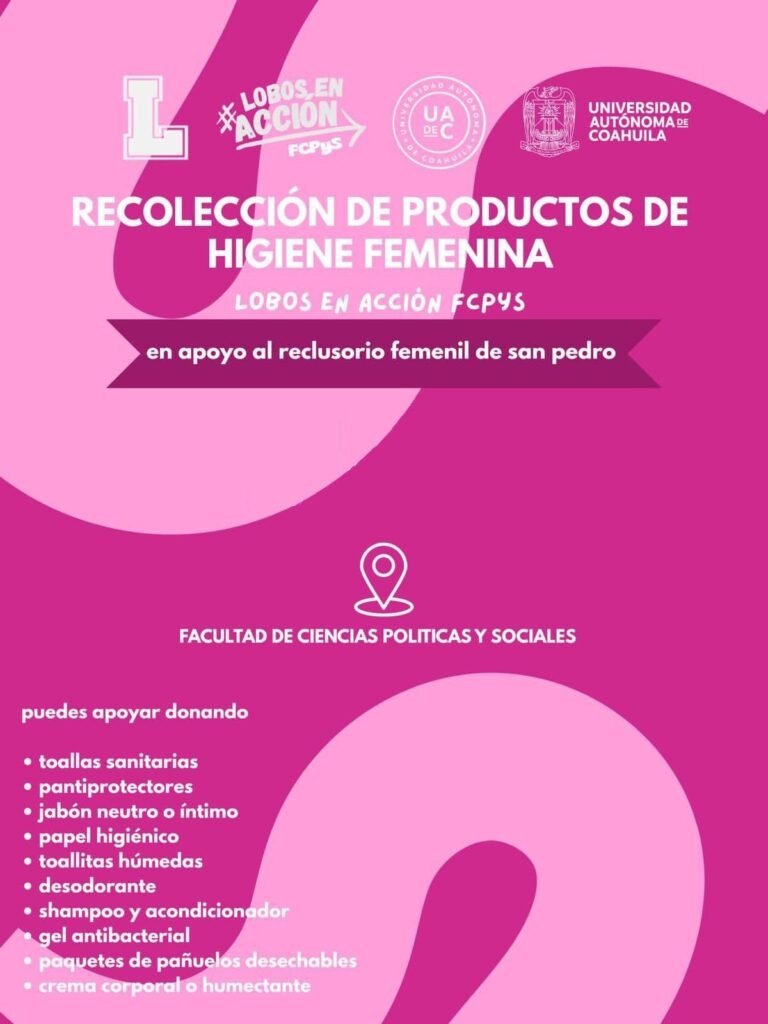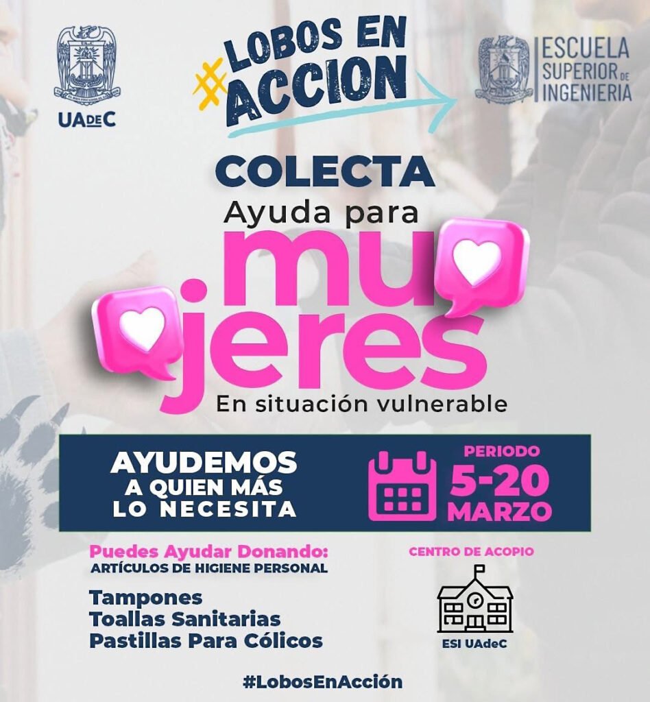Del 5 al 20 de marzo de 2026 el programa “Lobos en Acción” de la Escuela Superior de Ingeniería de la Unidad Norte estará realizando la Colecta “Ayuda para Mujeres en Situación Vulnerable” en la que se estarán recibiendo donaciones de artículos de higiene personal como tampones toallas sanitarias y pastillas para cólicos, de igual manera en la Facultad de Ciencias Políticas y Sociales de Unidad Laguna, en apoyo a las internas del reclusorio femenil de San Pedro, apoyar con toallas Sanitarias, panti protectores, jabón neutro, papel higiénico, desodorante, gel antibacterial, shampoo y acondicionador, pañuelos desechables y crema corporal.