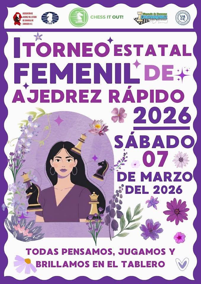 El Gobierno del Estado de Coahuila, a través de la Secretaría de Educación y en coordinación con el Instituto Estatal del Deporte de Coahuila y la Asociación de Ajedrez del Estado de Coahuila y en coordinación con la Coordinación de Deportes de la UAdeC invitan al Torneo Estatal Femenil de Ajedrez Rápido 2026, las personas interesadas pueden inscribirse en el enlace: https://docs.google.com/forms/d/e/1FAIpQLScnsR6-95Fm7KsDlzDGxLnDjkFv01WrlMFgcT8jUn1FSUQf1w/viewform a celebrarse el 7 de marzo.