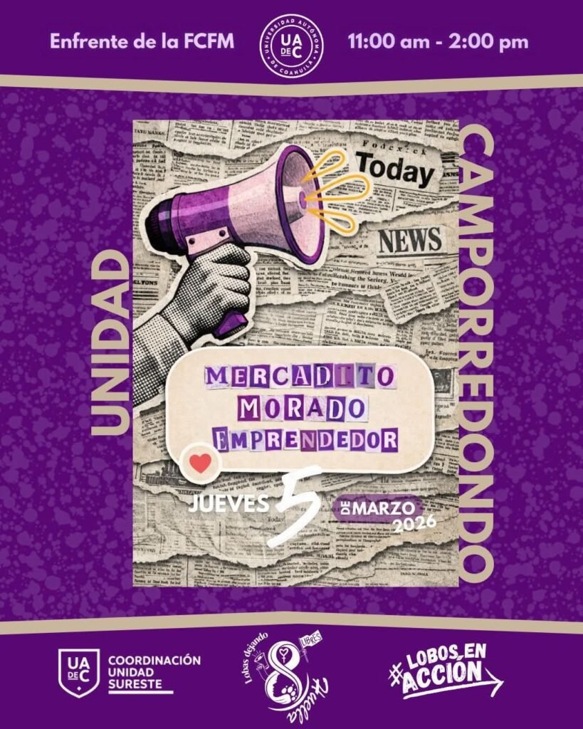 El 5 de marzo habrá un Mercadito Emprendedor en la explanada frente a la Facultad de Ciencia Educación y Humanidades de 11:00 a 14:00 horas y en Unidad Laguna en la Escuela de Ciencias de la Comunidad el Conversatorio Soy Mujer UAdeC a las 10:00 horas y a las 17:00 horas en la sala audiovisual del plantel