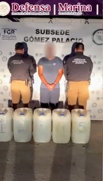 En el estado de Durango, los agentes de seguridad revisaron un tractocamión en el kilómetro 26+600 de la carretera 49D Torreón-Jiménez, tramo Gómez Palacio Bermejillo, en el municipio de Gómez Palacio, el cual transportaba cinco bidones con capacidad de 50 litros cada uno, que contenía una sustancia líquida similar a la heroína líquida, por lo que el conductor de 35 años de edad fue detenido.