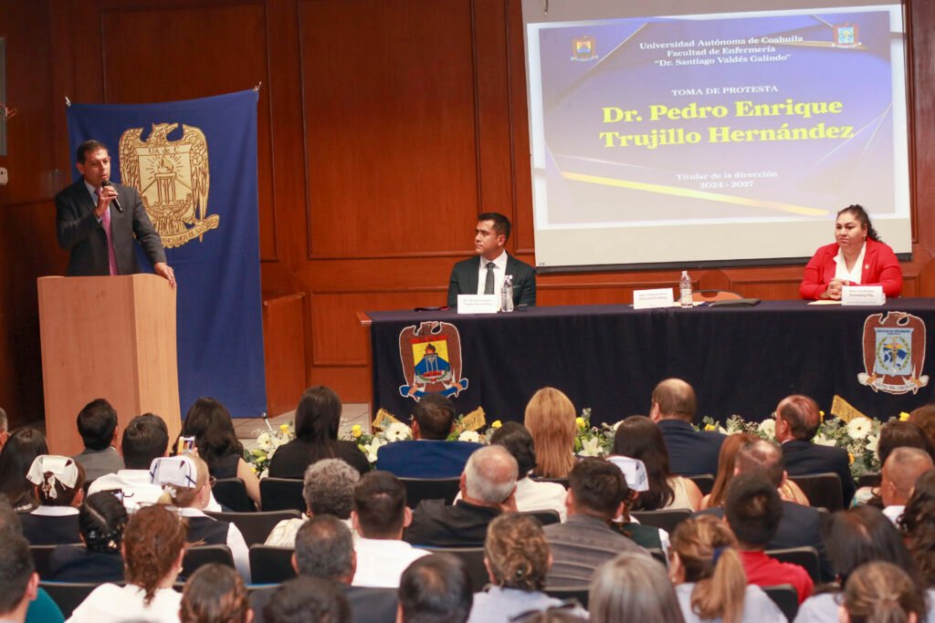 Saltillo, Coahuila.- El rector de la Universidad Autónoma de Coahuila, Octavio Pimentel Martínez, tomó protesta al Dr. Pedro Enrique Trujillo Hernández, como director de la Facultad de Enfermería “Dr. Santiago Valdés Galindo”, para el periodo 2024-2027.