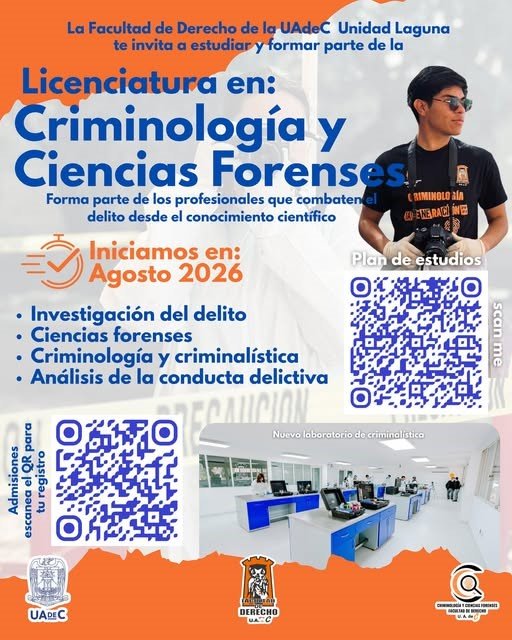 Torreón, Coahuila.- La Universidad Autónoma de Coahuila, a través de la Facultad de Derecho Unidad Laguna, invita a aspirantes interesados en el ámbito de la procuración e impartición de justicia a formar parte del proceso de admisión de agosto-diciembre 2026 e ingresar a la Licenciatura en Criminología y Ciencias Forenses.