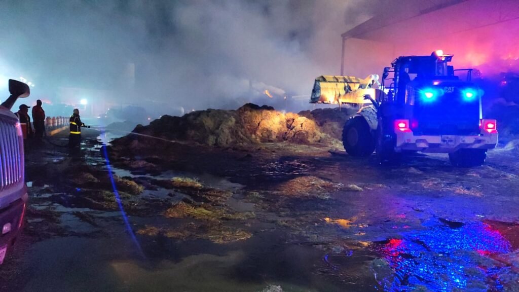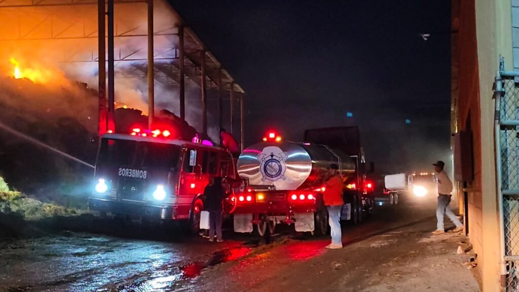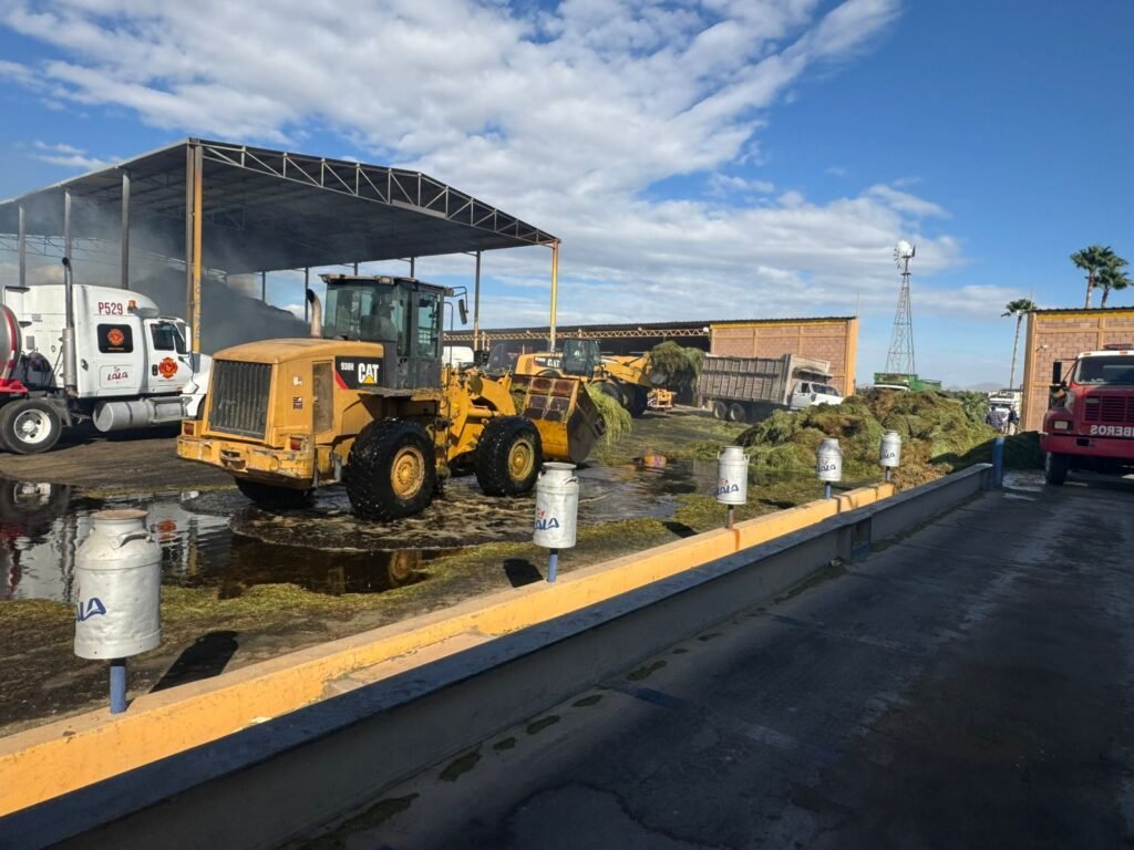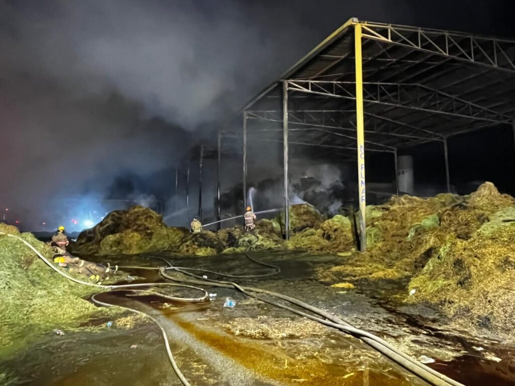 Torreón, Coahuila.- Aproximadamente 2 mil toneladas de alfalfa fueron consumidas por el incendio que se registró en un establo ubicado en el ejido Compuertas, en el municipio de Matamoros, donde a más de 24 horas de labores continuas, el siniestro ha sido controlado en un 95 por ciento, sin fuego activo y únicamente con enfriamiento de material remanente, informó la directora de Protección Civil del Estado en La Laguna, Claudia Verónica González Díaz.