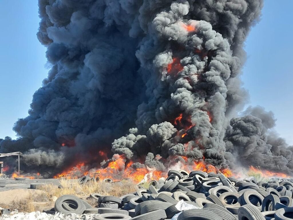 Gómez Palacio, Durango.- Elementos de la Dirección de Protección Civil y Bomberos de Gómez Palacio trabajan desde temprana hora de este martes en la contención de un incendio de llantas registrado en un predio ubicado en la parte posterior del 72 Batallón de Infantería, cuyo humo es visible desde distintos puntos de la ciudad y ha generado inquietud entre la población.